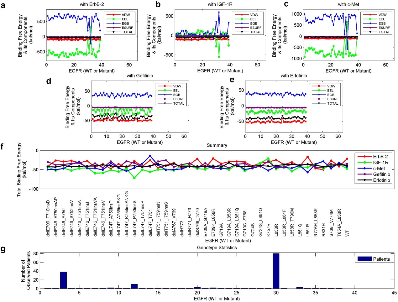 Figure 1. Binding free energy and its components of each mutant-inhibitor or mutant-partner system. (a) to (c), The energies for the systems that each involves a mutant and a dimerization partner (ErbB-2, IGF-1R or c-Met). (d) and (e), The energies for those systems concerning a mutant and an inhibitor (gefitinib or erlotinib). (f) The total binding free energies extracted from parts a to e, with the mutation types shown. (g) The statistical results of the mutation types among our NSCLC patients.