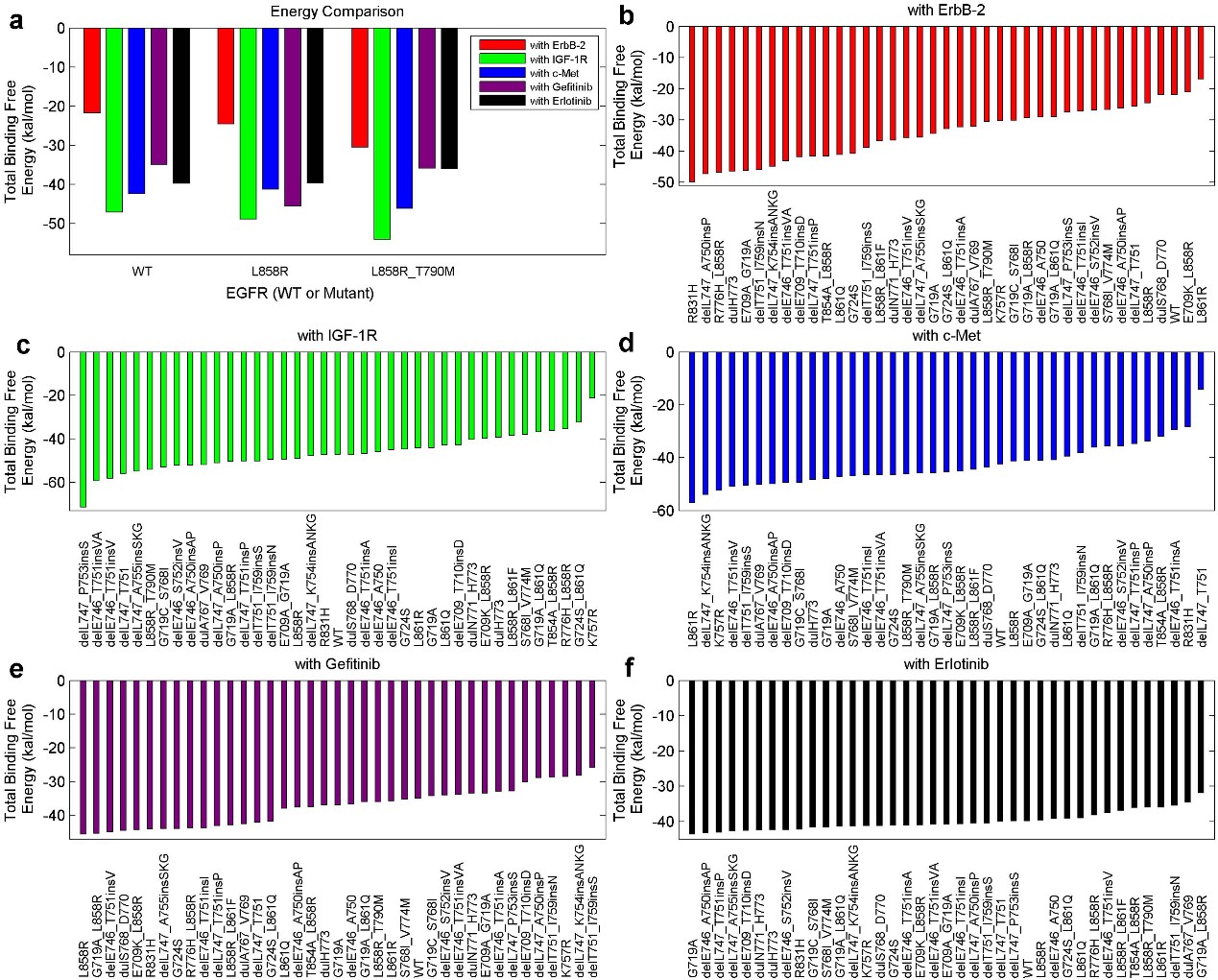 Figure 2. Total binding free energies of the mutant-inhibitor or mutant-partner systems, involving several specific mutants. (a), The total binding free energies between several important EGFR kinases (WT, L858R, L858R_T890M) and a dimerization partner (ErbB-2, IGF-1R, c-Met) or an inhibitor (gefitinib, erlotinib). (b) to (f), Ranked binding free energies for the systems regarding all of our mutants (37 types + WT + L858R_T790M) in an ascending order.