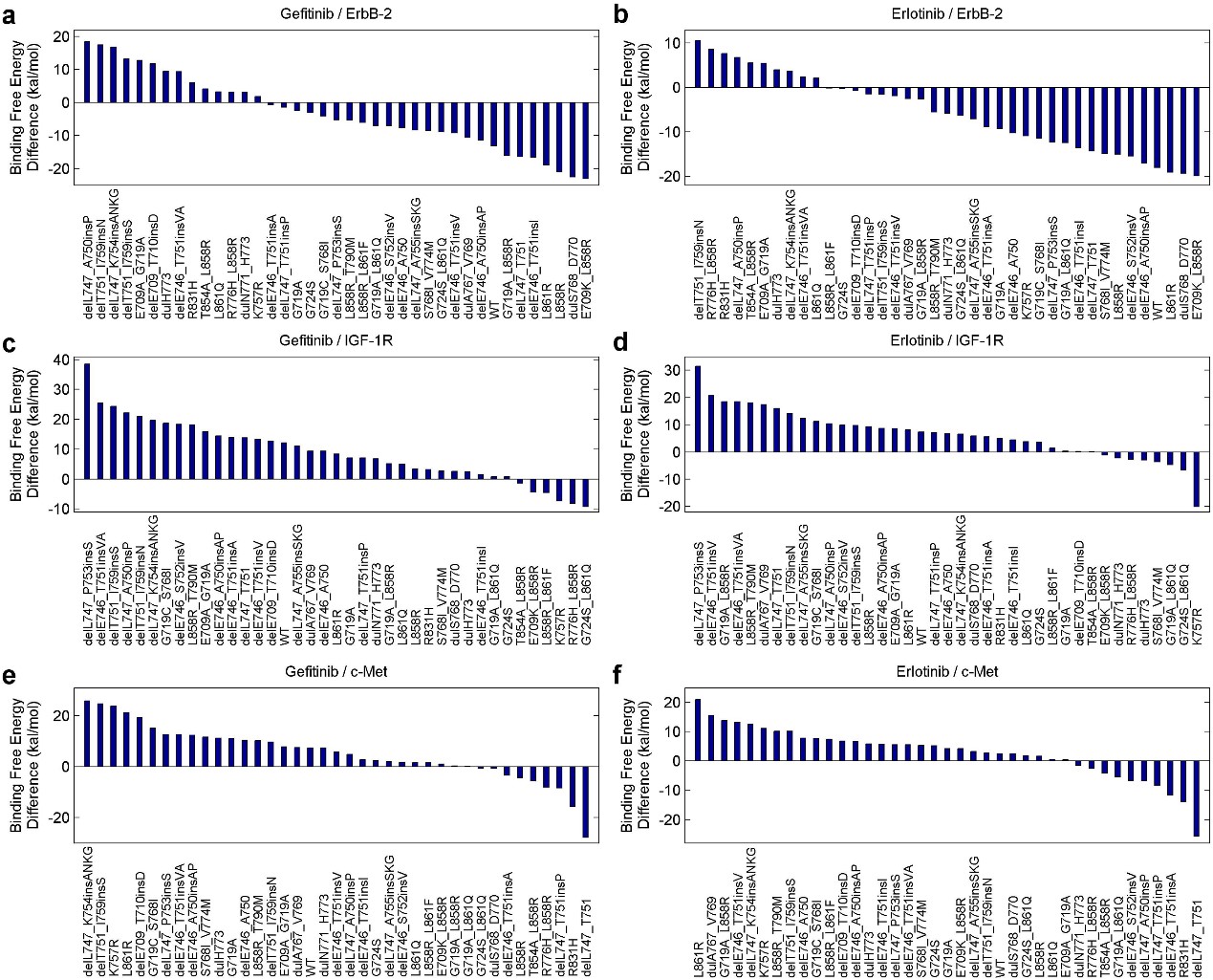 Figure 3. The difference between the total binding free energies of the mutant-inhibitor system and the mutant-partner system for each mutant. (a) and (b), The binding free energy differences between the systems involving ErbB-2 and the two inhibitors (gefitinib and erlotinib), with the values ranked in the descending order. (c) and (d), The similar binding free energy differences between the systems concerning IGF-1R and the two inhibitors. (e) and (f), The binding free energy differences between the systems concerning c-Met and the two inhibitors.