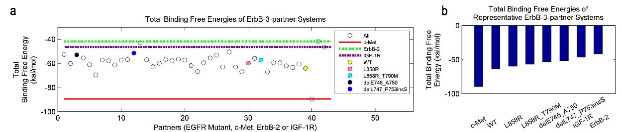 Figure 4. Computational results for ErbB-3-partner systems. (a) Total binding free energy comparison among ErbB-3-partner systems. Binding free energies of ErbB-3—c-Met, ErbB-3—ErbB-2 and ErbB-3—IGF-1R systems are labeled with lines, and those of systems involving WT EGFR, L858R, L858R_T790, delE746_A750 and delL747_P753insS are marked with solid spheres. (b) Ranked total binding free energies of representative ErbB-3-partner systems.