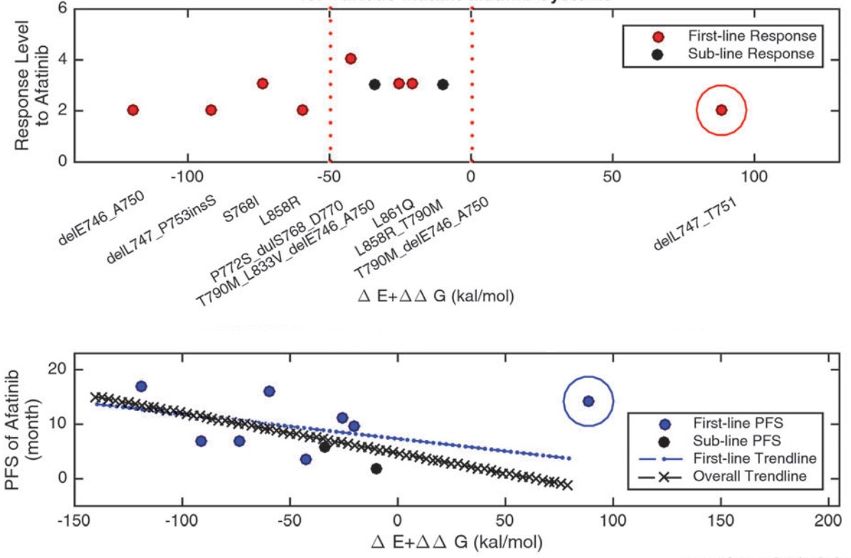 EGFR-mutated non-small-cell lung cancer (NSCLC) has long been a research focus in lung cancer studies. Besides reversible tyrosine kinase inhibitors (TKIs), new-generation irreversible inhibitors, such as afatinib, embark on playing an important role in NSCLC treatment. To achieve an optimal application of these inhibitors, the correlation between the EGFR mutation status and the potency of such an inhibitor should be decoded. In this study, the correlation was profiled for afatinib, based on a cohort of patients with the EGFR-mutated NSCLC. Relying on extracted DNAs from the paraffin-embedded tumor samples, EGFR mutations were detected by direct sequencing. Progression-free survival (PFS) and the response level were recorded as study endpoints. These PFS and response values were analyzed and correlated to different mutation types, implying a higher potency of afatinib to classic activation mutations (L858R and deletion 19) and a lower one to T790M-related mutations. To further bridge the mutation status with afatinib-related response or PFS, we conducted a computational study to estimate the binding affinity in a mutant–afatinib system, based on molecular structural modeling and dynamics simulations. The derived binding affinities were well in accordance with the clinical response or PFS values. At last, these computational binding affinities were successfully mapped to the patient response or PFS according to linear models. Consequently, a detailed mutation-response or mutation-PFS profile was drafted for afatinib, implying the selective nature of afatinib to various EGFR mutants and further encouraging the design of specialized therapies or innovative drugs.