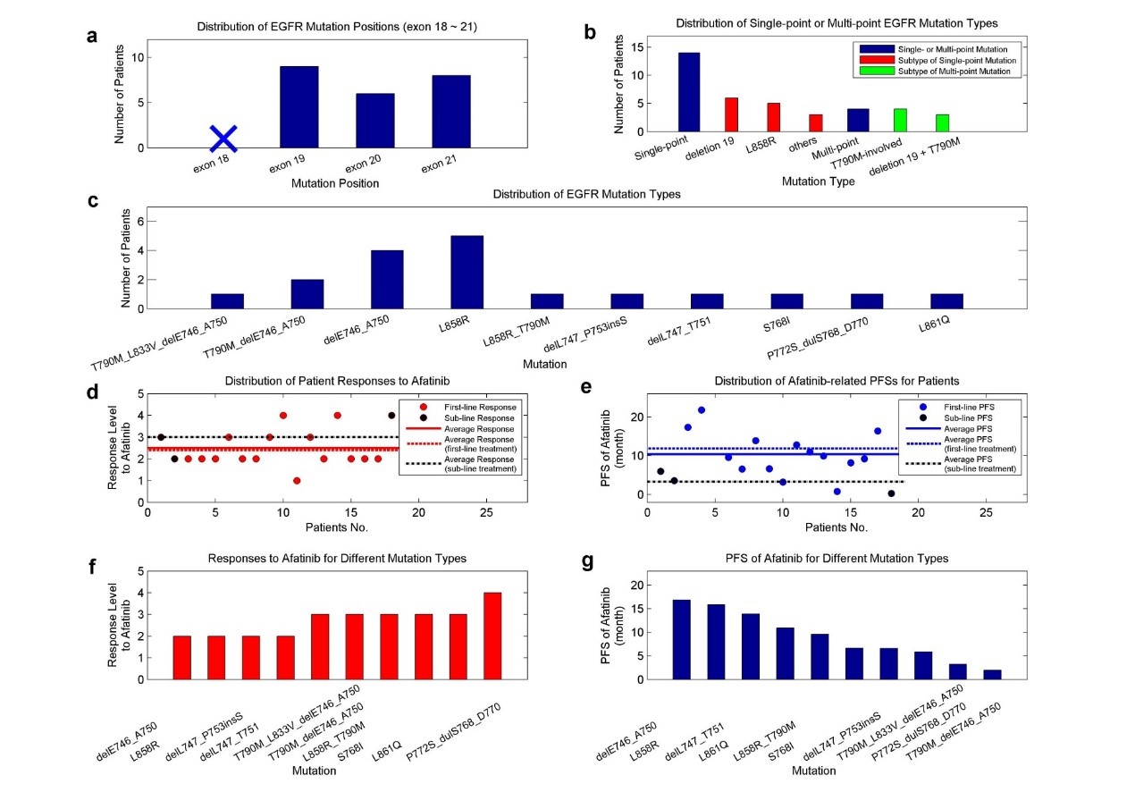 Figure 1. EGFR mutation profile and afatinib efficacy analysis of the patients. (a) EGFR mutation positions (exons 18 to 21) of the NSCLC patients. (b) EGFR mutation subtypes of the NSCLC patients. (c) Specific EGFR mutation types of the NSCLC patients. (d) Responses to afatinib during the TKI therapies, with first-line and sub-line treatments considered. (e) PFS values of afatinib during the therapies, with first-line and sub-line treatments considered. (f) Responses to afatinib regarding different mutation types. (g) PFS values of afatinib regarding different mutation types.