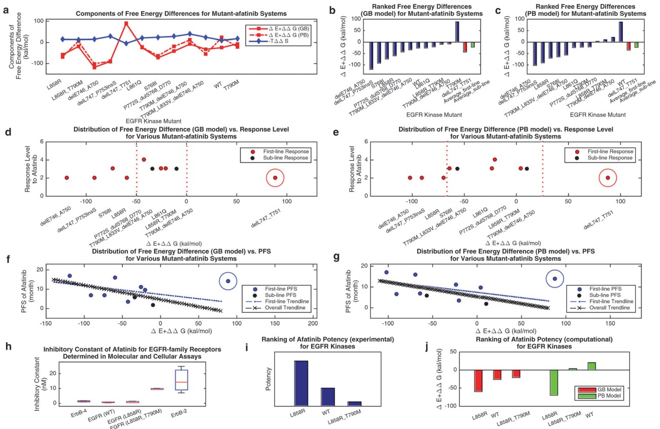 Figure 2. Analyses of the computationally resolved binding affinities in mutant-afatinib systems. (a) Simplified free energy differences (△E + △△Gsolv) solved by the GB or PB model and the entropy term (-T△S) for various mutant-afatinib systems. (b and c) Ranked free energy differences from (a). Here averaged free energy differences, respectively, of the mutations regarding first-line-afatinib treatments and those corresponding to sub-line-afatinib treatments, are displayed. (d) Distribution of the free energy difference (GB model) vs. response level, with an outlier marked. (e) Distribution of the free energy difference (PB model) vs. response level, with an outlier marked. (f) Distribution of the free energy difference (GB model) vs. PFS, with trendlines presented and an outlier marked. (g) Distribution of the free energy difference (PB model) vs. PFS, with trendlines presented and an outlier marked. (h) Experimentally resolved inhibitory constants of afatinib for different EGFR-family receptors. (i) Ranking of afatinib potency for EGFR kinases with reference to (g). (j) Ranking of computationally resolved afatinib potency for EGFR kinases, with both the GB and PB models considered.
